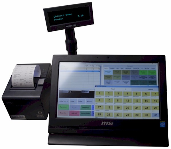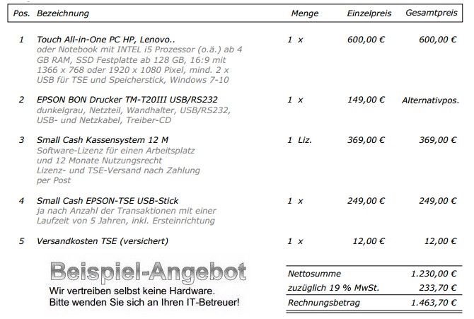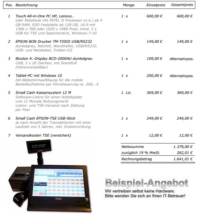 HardwareStandard-Windows-PC *:Notebook, Touch-PC oder PC mit Touch-Monitor (CPU ab INTEL 5, RAM ab 4 GB, HDD mit freien 1 GB, min. 2 x USB für RKS-V/TSE-Einheit und USB Datenexport) Bildschirmauflösung: Format 4:3 mit 1024 x 768 Pixel Empfehlung: Format 16:9 mit 1366 x 768 oder 1920 x 1080 Pixel (Vollbildmodus mit ausgeblendeter Windows Taskleiste) Thermo-Bon-Drucker 80 mm (EPSON TM-T20,7x,8x..) bzw. einen funktionierenden Standard-Drucker unter Windows bereits in der DEMO-Version! Optional bei Bedarf: Kassenschublade (EPSON kompatibel) Barcodescanner für EAN-Anbindung EC-Terminal (Kartenleser) A4 Drucker für Rechnungen und Listen SoftwareMS Windows 7 - 11Admin- bzw. Benutzer-Rechte mit Vollzugriff (Schreiben, Lesen, Ändern..) für das Programmverzeichnis "LW:\SmallCash12M..", einen funktionsfähigen Standard- Druckertreiber, Foxit Reader oder Adobe für die Anzeige erstellter PDF-Dateien Bei Bedarf mit unserem Kassenbuch und der Datenübergabe: Small Cash ![]() ![]() * MAC-OS mit Parallel-Desktop und Windows |
