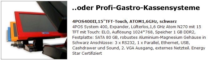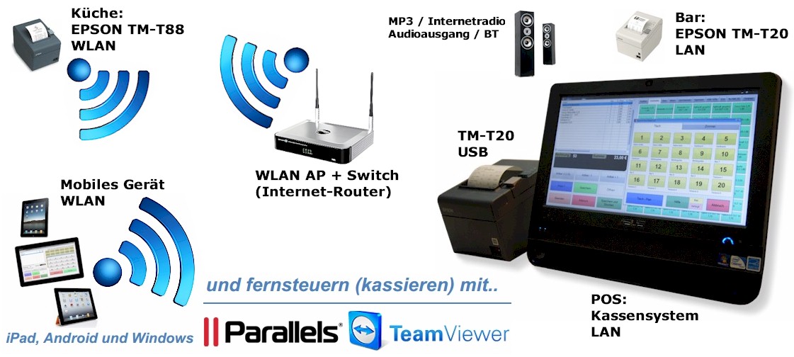 ist alternativ und damit preiswert möglich! Sie können direkt an der Kasse oder mit einem mobilen Gerät am Tisch Bestellungen aufnehmen oder Kassieren und die Belege drucken. Eingesetzte Geräte sollten ebenfalls die gleiche Bildschirmauflösung von mindestens 1024 x 768 Pixel (besser 1366 x 768) unterstützen. Durch die Fernbedienung ist sicher gestellt, dass selbst bei einem Ausfall der WLAN-Verbindung keine Daten verloren gehen und die Fernsteuer-Sitzung einfach fortgesetzt werden kann. Da nur jeweils ein Kassensystem gesteuert wird, ist die Anzahl der Benutzer auf 2 bis 3 beschränkt (bucht gerade ein Kellner, muss der zweite Kellner warten). Weitere Hinweise findet man hier: ![]() ![]() |
